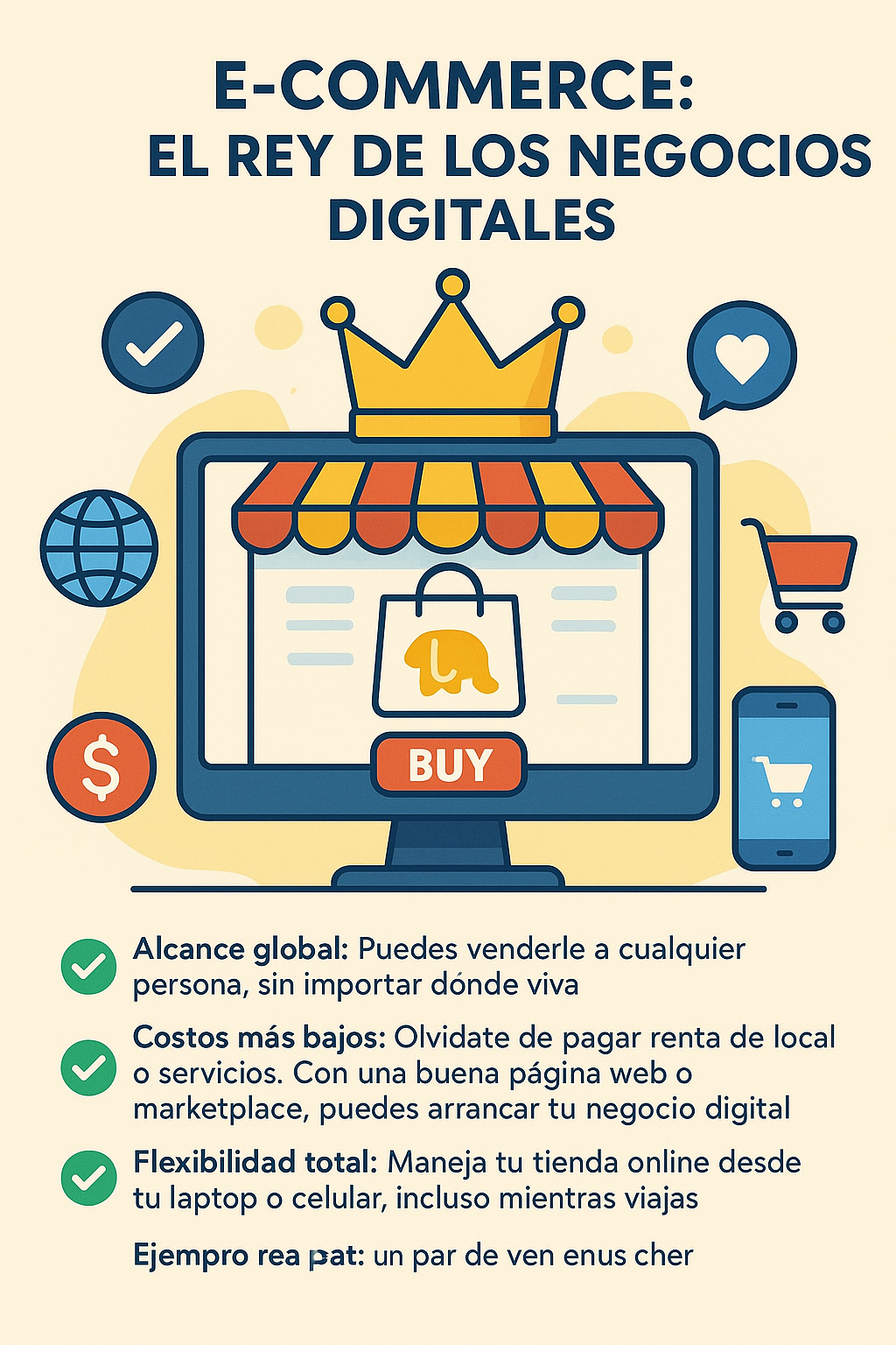 El e-commerce es, sin duda, el modelo de negocio digital más popular y rentable en todo el mundo. Se trata de vender productos o servicios por internet, sin necesidad de una tienda física. Hoy en día, millones de personas prefieren comprar en línea, lo que convierte al comercio electrónico en una de las mejores oportunidades para emprender.